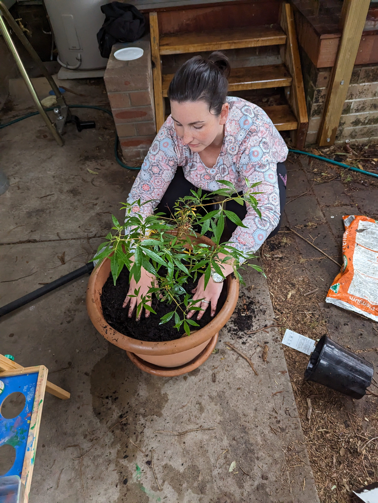 I put a small layer of soil on the bottom of the pot and then added the cut portions of the placenta. Lots more soil onto of that, then the plant, then covered the rest in more soil. Finally, some mulch over the top. Aimee took photos for me, and helped me up-end the bag of soil to dump the contents out! I gave it a good drenching and then Aimee helped me move it into position - sitting next to my 30th birthday olive tree. The milestone plant collection.